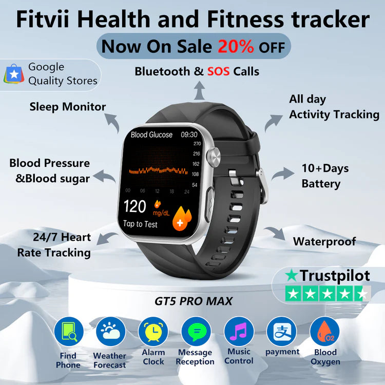 Upgrade Fitvii®GT5 Pro Max Blood Sugar Smartwatch with Blood Pressure + ECG + Sleep Fitness Tracker+Free Straps💝